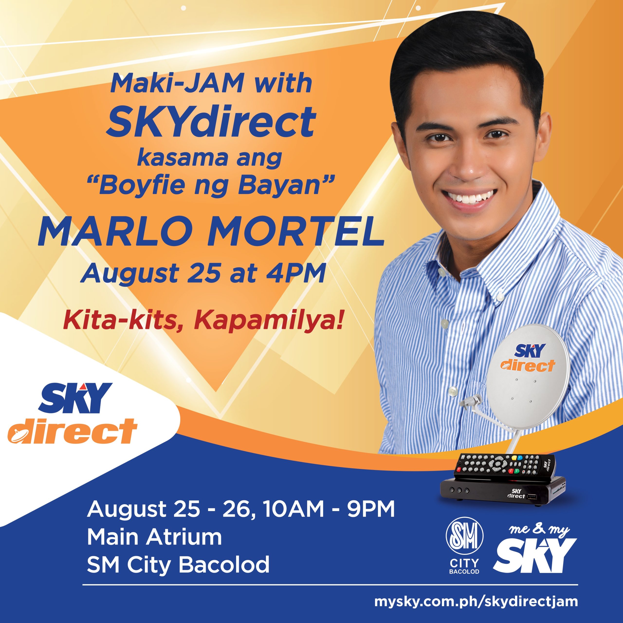 A weekend full of fun and surprises together with Kapamilya celebrity and “Boyfie ng Bayan” Marlo Mortel await Bacolod as SKYdirect Jam hits SM City on August 25 and 26 (Saturday and Sunday).