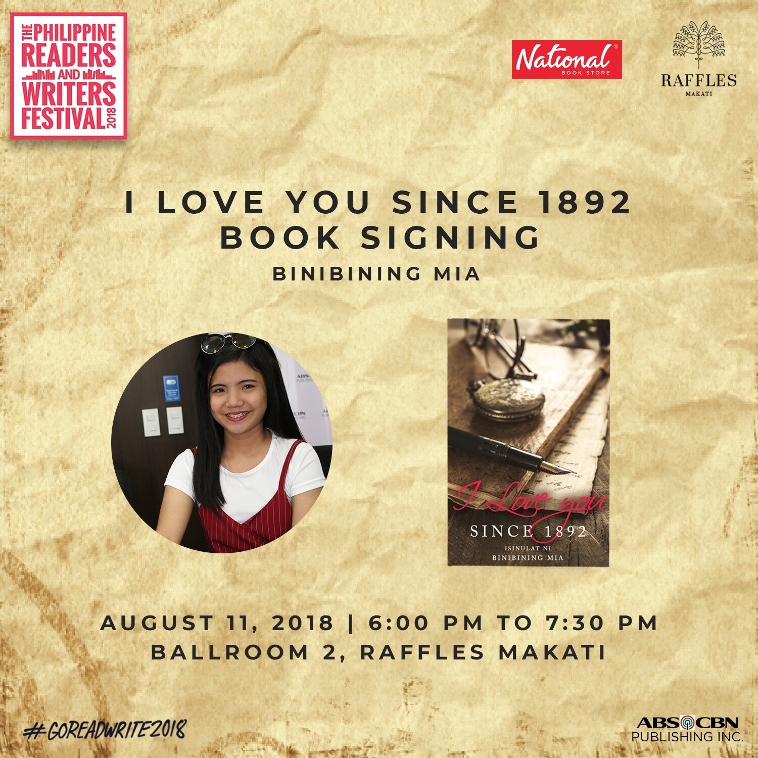 Admission is free at the three-day reading fest happening from August 10 to 12 at Raffles Makati. For the book signing events, only books purchased from National Book Store, NBS Express, and Powerbooks will be accommodated. ABS-CBN books may be purchased on-site.