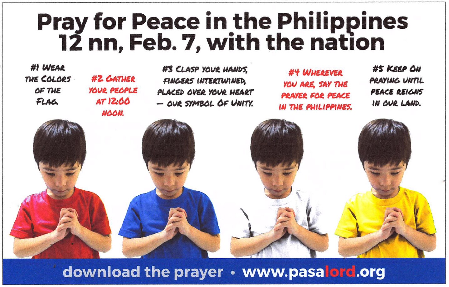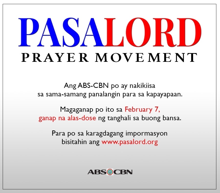 ABS-CBN joins the PasaLord Prayer Movement in calling on Filipinos of every creed and denomination to pray for our country in the first nationwide synchronized moment of prayer tomorrow, Thursday (February 7) at 12 noon.