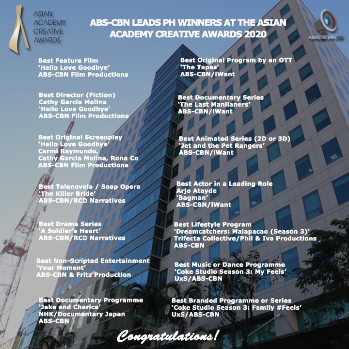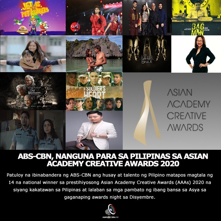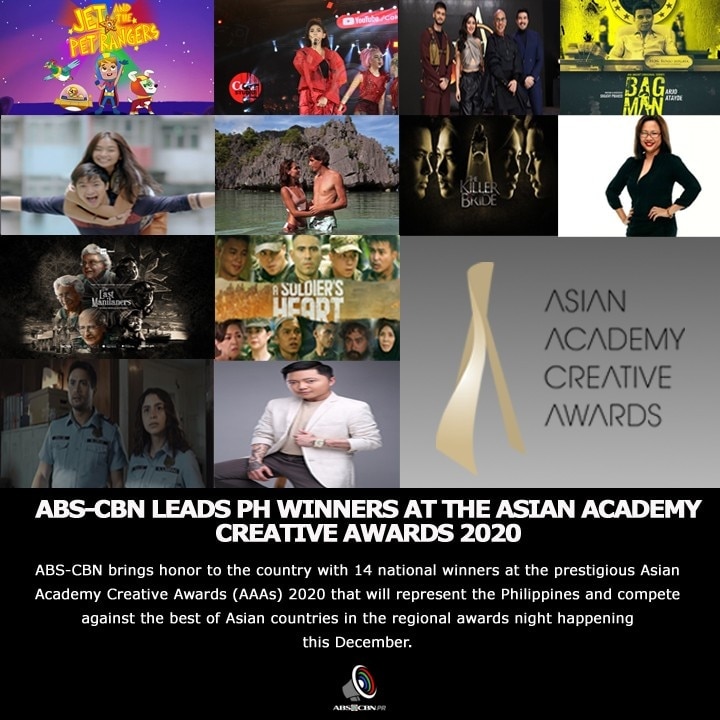ABS-CBN brings honor to the country with 14 national winners at the prestigious Asian Academy Creative Awards (AAAs) 2020 that will represent the Philippines and compete against the best of Asian countries in the regional awards night happening this December.