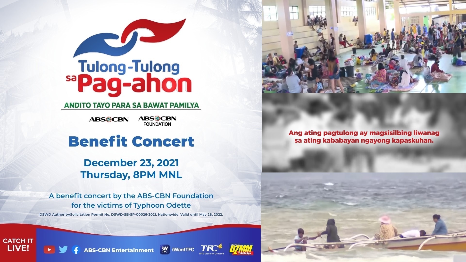 ABS-CBN is streaming its “Tulong Tulong sa Pag-Ahon: Andito Tayo Para Sa Bawat Pamilya” benefit concert on ABS-CBN Entertainment’s YouTube and Facebook accounts, iWantTFC, cable TV channel TeleRadyo, and TFC IPTV abroad tonight (Dec 23) from 8 pm to 11 pm (PHT).