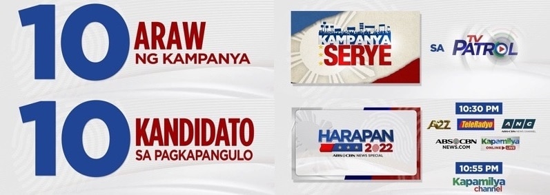 Kampanyaserye airs within “TV Patrol” while “Harapan 2022” is shown around 10:30 pm on A2Z, TeleRadyo, ANC, news.abs-cbn.com, and Kapamilya Online Live and at 10:55 pm on Kapamilya Channel.