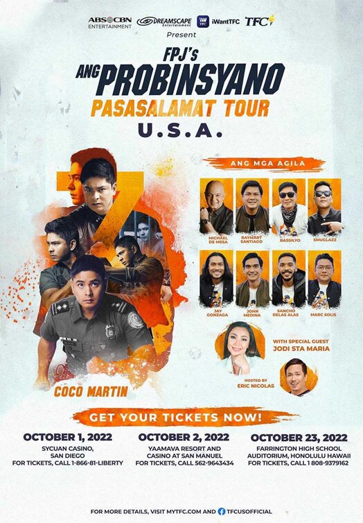 To celebrate this historic teleserye that has touched the lives of so many viewers and fans around the world, ABS-CBN Entertainment, Dreamscape Entertainment, iWantTFC and TFC are bringing "FPJ's Ang Probinsiyano Pasasalamat Tour" to the U.S. starting October 1 at Sycuan Casino in San Diego, CA, on October 2 at Yaamava' Resort and Casino at San Manuel in Highland, California, and on October 23 at Farrington High School Auditorium in Honolulu, Hawaii.