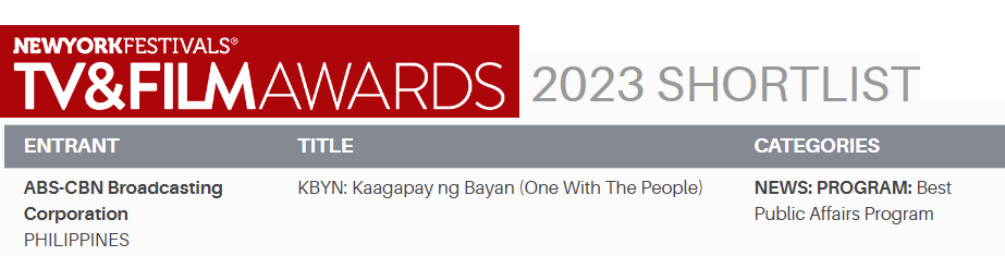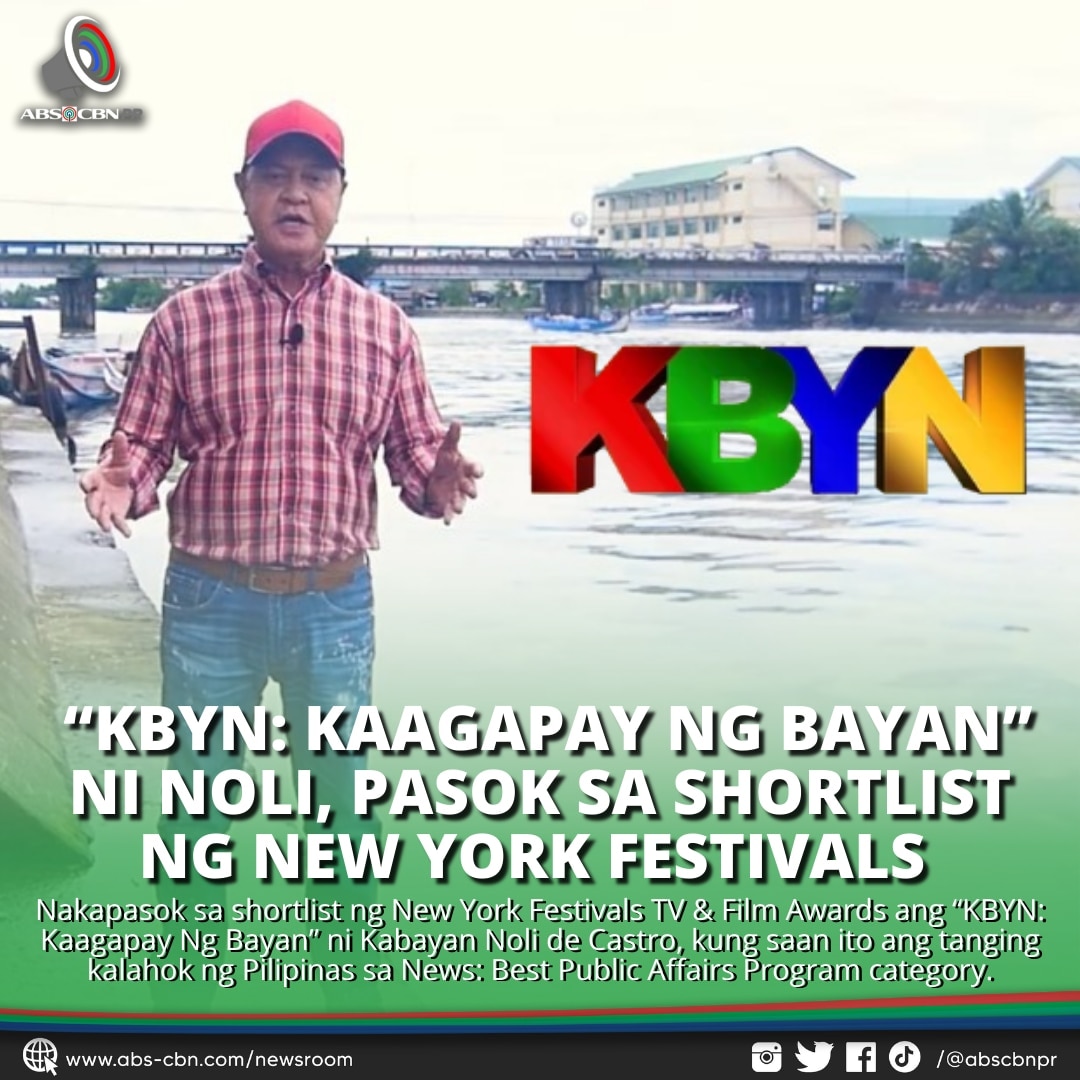 ABS-CBN News' “KBYN: Kaagapay Ng Bayan,” hosted by Kabayan Noli de Castro, made it to the shortlist of this year’s New York Festivals TV & Film Awards as the Philippines' sole entrant in the News: Best Public Affairs Program category.