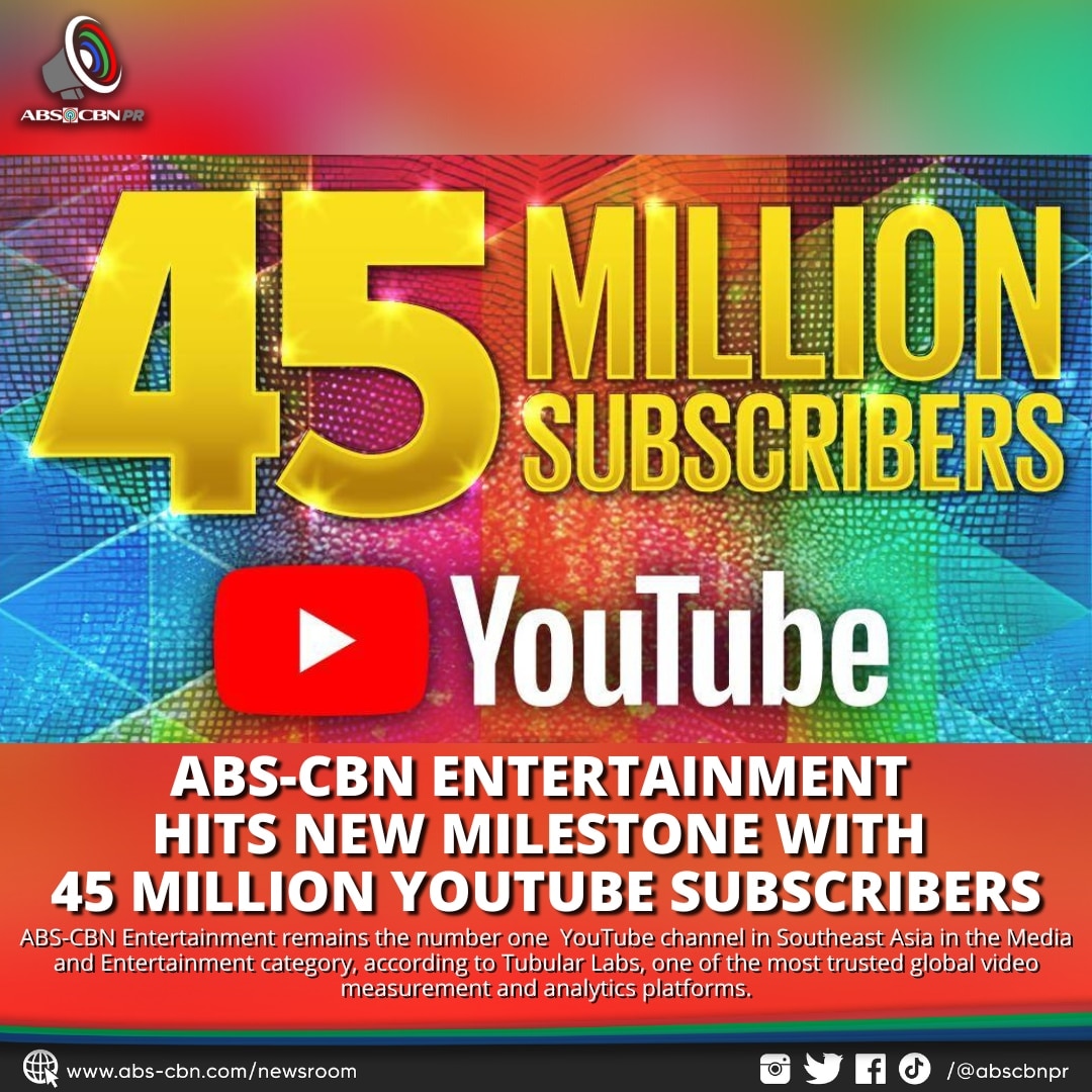 ABS-CBN Entertainment has hit a new milestone on YouTube with 45 million subscribers as it remains the most subscribed YouTube channel in all of Southeast Asia.