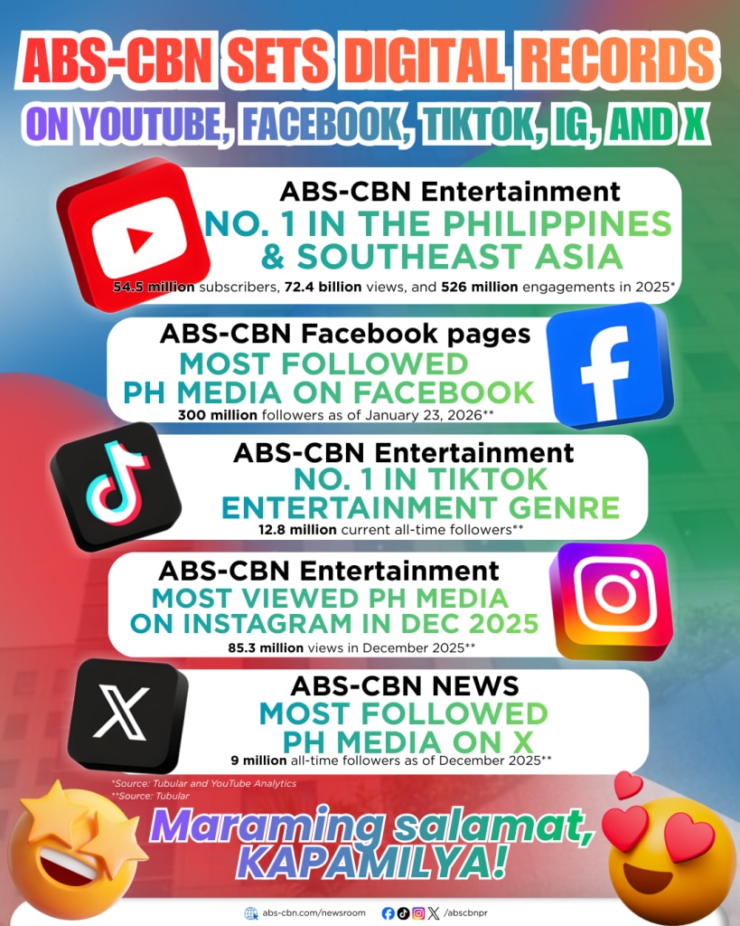 On Facebook, ABS-CBN maintained its strong digital presence as its combined official network, program, and affiliated pages have collectively reached 300 million followers as of January 23, 2026, making it the most followed Philippine media on the platform, based on Tubular’s data.