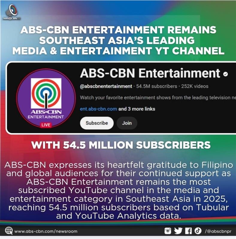 ABS-CBN expresses its heartfelt gratitude to Filipino and global audiences for their continued support as ABS-CBN Entertainment emerged as the most subscribed YouTube channel in the media and entertainment category in Southeast Asia in 2025, reaching 54.5 million subscribers based on Tubular and YouTube Analytics data.