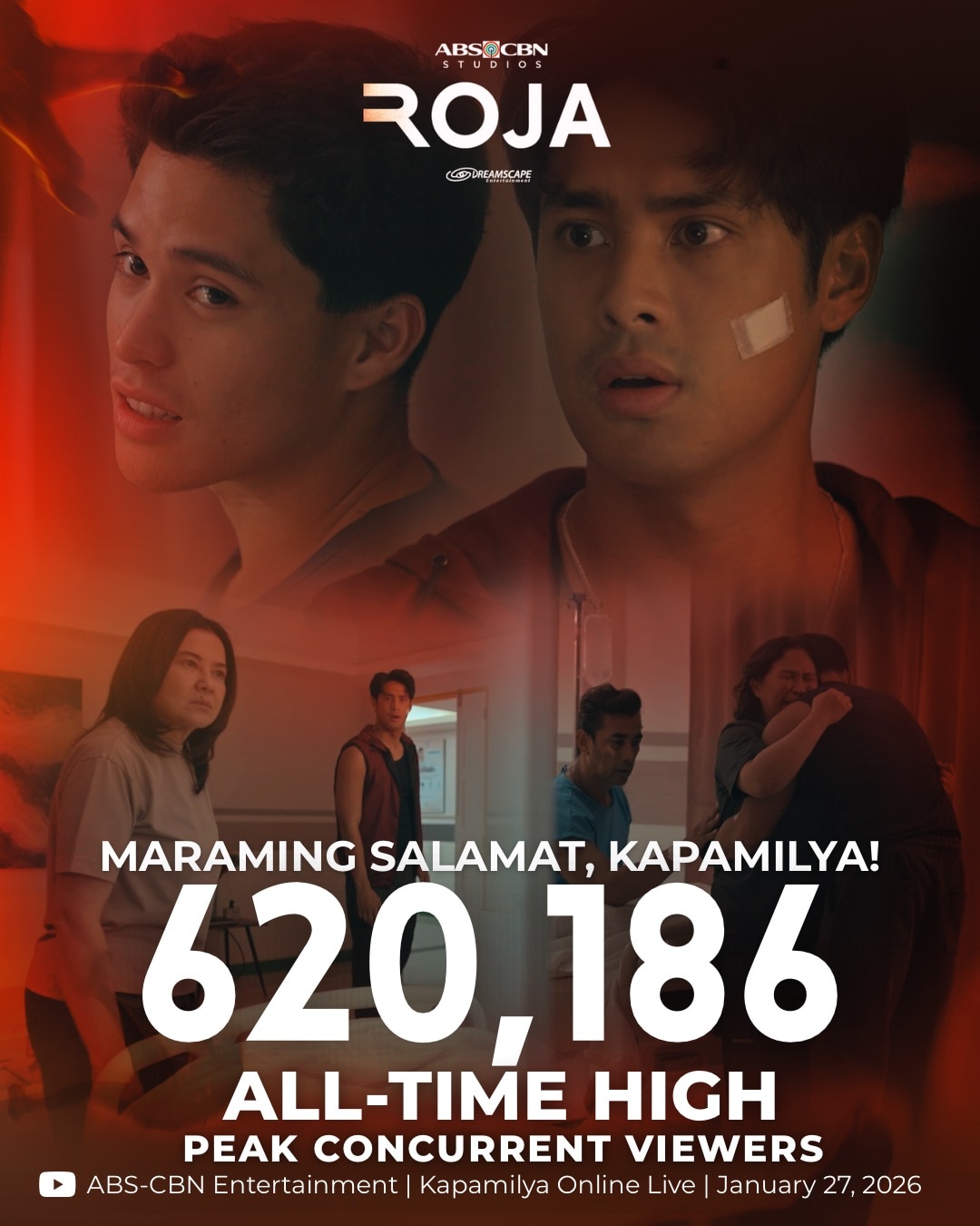 The Kapamilya primetime series set its own all-time high record last night of 620,186 peak concurrent online viewers on Kapamilya Online Live on ABS-CBN Entertainment’s YouTube, the most subscribed YouTube media and entertainment channel in Southeast Asia.