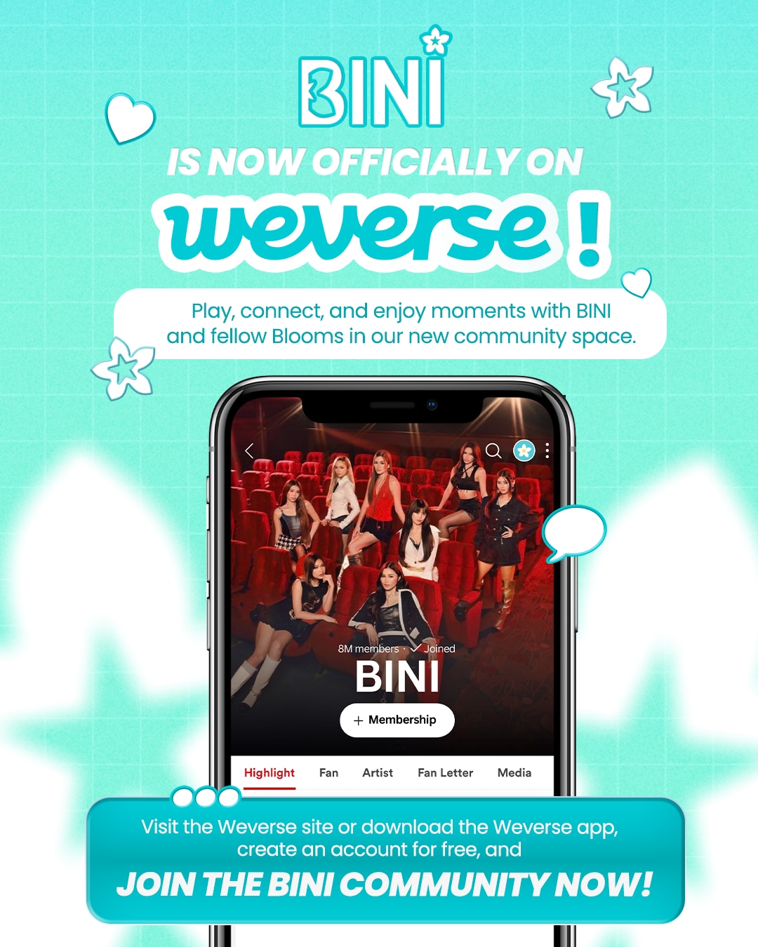 Join BINI in the exciting superfan community now, go to the Weverse site or download the Weverse app. For updates, follow BINI on Facebook, X (Twitter), Instagram, TikTok, and YouTube, or visit bini.abs-cbn.com.